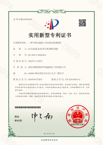 5月28日,由湖北路橋華晟通公司自主研發(fā)的新型實(shí)用專利《一種可調(diào)式混凝土外加劑定量灌裝機(jī)》順利通過國家知識(shí)產(chǎn)權(quán)局嚴(yán)格審查,獲得專利證書。在特種混凝土領(lǐng)域,湖北路橋華晟通公司獲得多個(gè)專利、軟著、標(biāo)準(zhǔn)圖集、科技項(xiàng)目、實(shí)體工程及標(biāo)準(zhǔn)等相關(guān)知識(shí)產(chǎn)權(quán),牢固占據(jù)特種混凝土新賽道,進(jìn)一步增強(qiáng)了公司科研創(chuàng)新驅(qū)動(dòng)生產(chǎn)發(fā)展的強(qiáng)大動(dòng)力。