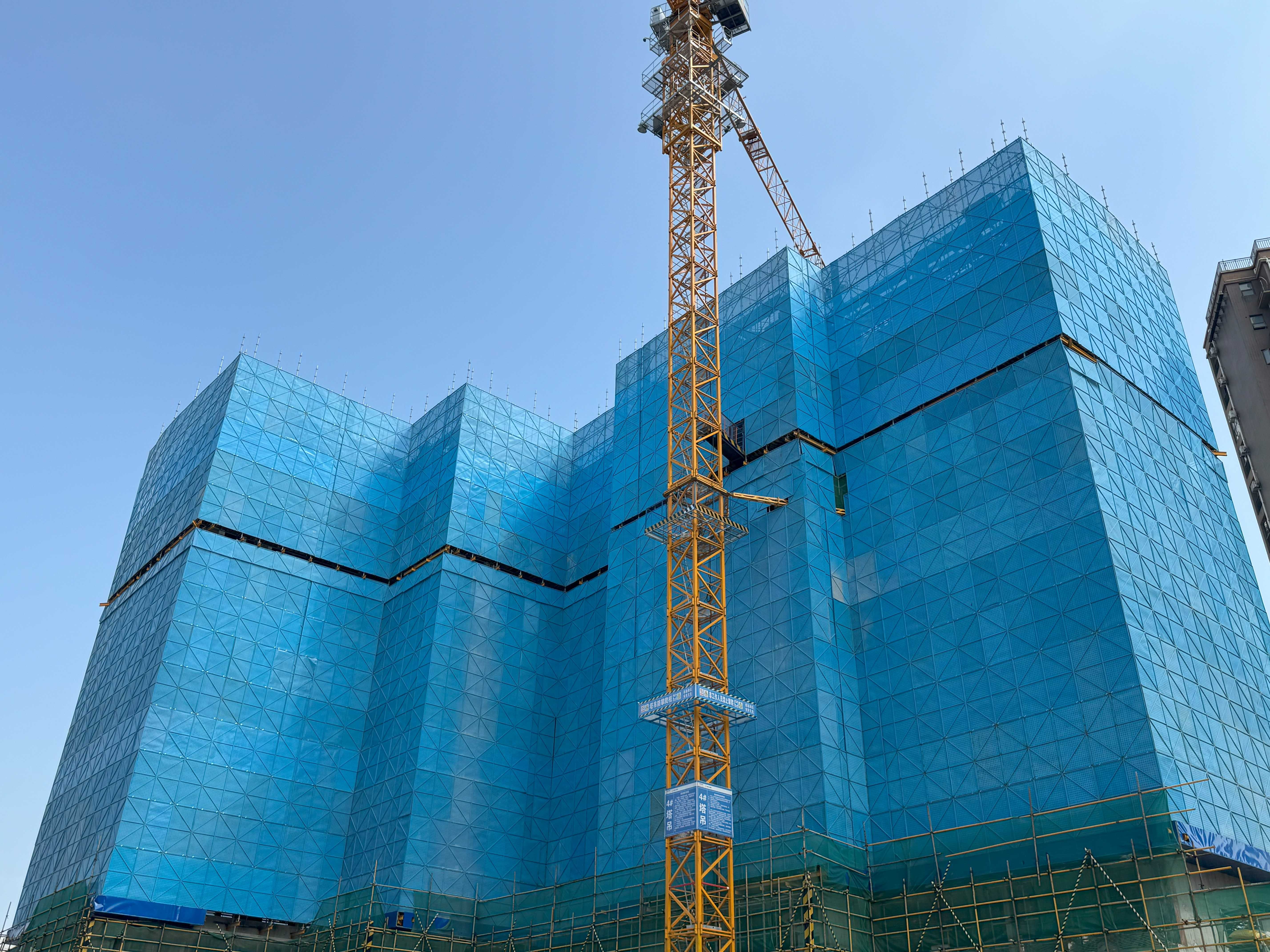 走進(jìn)施工現(xiàn)場(chǎng),極目新聞?dòng)浾呖吹剑诮ǖ?棟高層建筑外立面上采用藍(lán)色的花籃懸挑腳手架,既美觀又安全。?