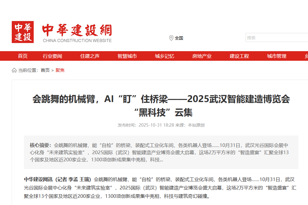 近日,2025國際(武漢)智能建造產(chǎn)業(yè)博覽會在武漢舉辦,聯(lián)投湖北路橋作為參展單位參加本次博覽會,中華建設(shè)網(wǎng)對聯(lián)投湖北路橋“黑科技”進(jìn)行報道,以下是相關(guān)報道: