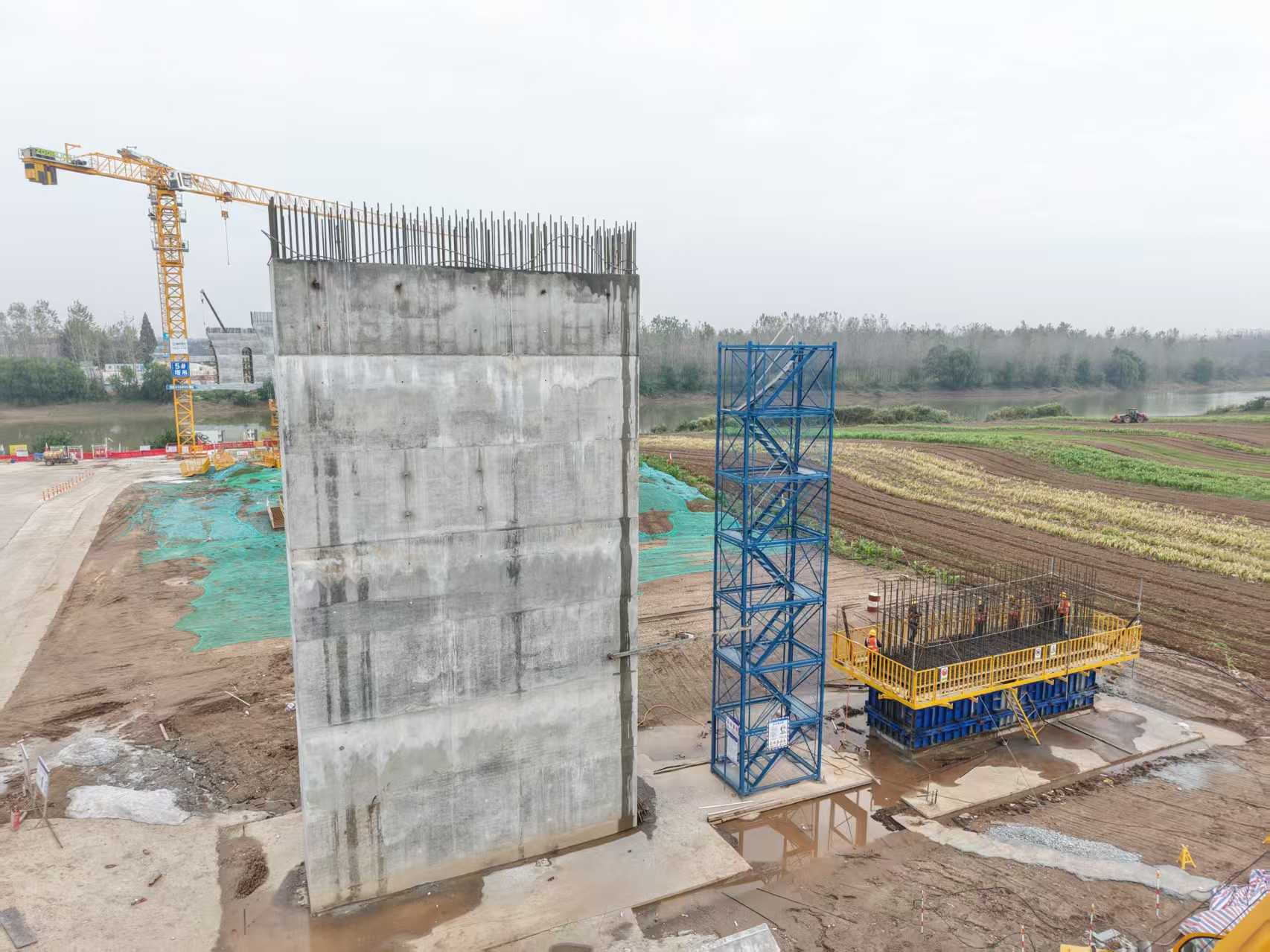 本次封頂?shù)?/span>4#過渡墩是連接松虎河引橋與主橋的關(guān)鍵墩位,采用分離式矩形實體墩設(shè)計,具有結(jié)構(gòu)穩(wěn)定、承載能力強的特點。墩身橫橋向?qū)?米、順橋向?qū)?.2米,采用C40高性能混凝土現(xiàn)澆工藝,澆筑方量達317.1立方米。為保障混凝土強度與耐久性,施工完成后立即啟動定時自動噴淋養(yǎng)生系統(tǒng),通過智能控制濕度與頻次,有效預(yù)防混凝土表面裂縫,確保墩身結(jié)構(gòu)質(zhì)量。